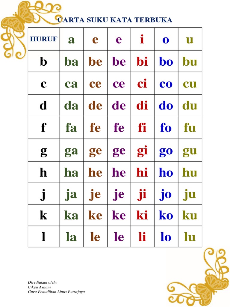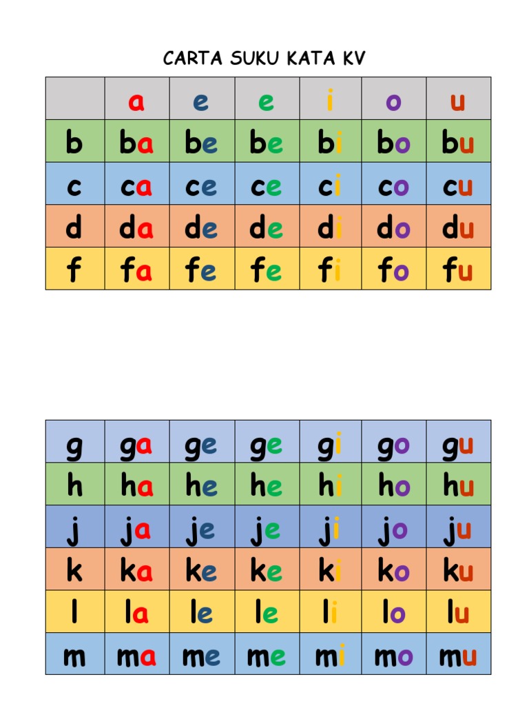 Bahasa malaysia tahun 1 carta suku kata terbuka. A i u e e o b ba bi bu be be bo c ca ci cu ce ce co d da di du de de do f fa fi fu fe fe fo g ga gi gu ge ge go h ha hi hu he he ho j ja ji ju je je jo k ka ki ku ke ke ko l la li lu le le lo carta suku kata kv. Carta suku kata kv latih tubi sebut, eja dan baca suku kata kv. Mimisuzana 13 apr 2016, 12:00:00. Seterusnya murid menulis dan menyalin apa yang diajar seperti huruf, suku kata, perkataan dan frasa di atas.