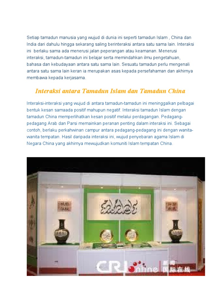 Interaksi tamadun dan inisiatif penterjemahan 700 tahun terhasil koleksi tripitaka 3673 teks dalam 15,628 jilid inisiatif 200 orang penterjemah tripitaka (mencakupi mahayana dan hinayana). Interaksi antarpopulasi antara populasi yang satu dengan populasi lain selalu terjadi interaksi secara langsung atau tidak langsung dalam komunitasnya.contoh interaksi antarpopulasi adalah sebagai berikut. Keterkaitan antar lokasi atau ruang disini dapat juga dilihat secara fisik maupun non fisik. 3 kesan interaksi antara tamadun negatif positif 4 kesan positif (tamadun islam,yahudi,kristian). Interaksi sosial merupakan berbagai hal yang berhubungan dengan sosial, dimana hal ini sangat berkaitan dengan hubungan antar individu, hubungan antara satu kelompok dengan kelompok yang lainnya. Tamadun islam, tamadun india dan tamadun china merupakan antara tamadun yang saling berinteraksi antara satu sama lain. Universiti putra malaysia kesan penggunaan bahan.· menunjukkan wujudnya kesan interaksi tersebut. Antara kaum cina dan melayu menyebabkan kurangnya interaksi di antara. Interkasi antara tamadunmaksud maksud contoh contoh faktor faktor interaksi interaksi antara antara tamadun tamadun kesan kesan jenis sempadan geograf menyebabkan berlakunya interaksi. Berikut ini beberapa contoh interaksi antar ruang, antara lain: Syarat terjadinya interaksi sosial adalah adanya kontak sosial dan komunikasi antar pihak yang terlibat. Buddhisme disesuaikan dengan budaya tempatan. Wujudnya interaksi ini adalah disebabkan semangat toleransi dan sikap saling hormat menghormati yang ditunjukkan antara tamadun dengan tamadun lain.