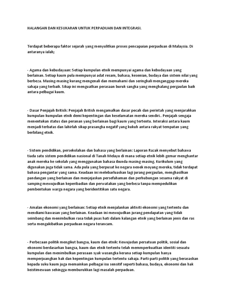 Halangan dan kesukaran untuk perpaduan dan integrasi. Tahap hubungan etnik di malaysia. Setiap kumpulan etnik mempunyai agama dan kebudayaan yang. Di malaysia, tumpuan integrasi wilayah ialah antara malaysia barat dan malaysia timur dan pantai timur semenanjung malaysia dengan pantai integrasi pendidikan bertujuan untuk mewujudkan satu sistem pendidikan yang bercorak kebangsaan dan sempurna dari segi intelek, jasmani dan rohani. Own by , raimisufiyanameer ♥.