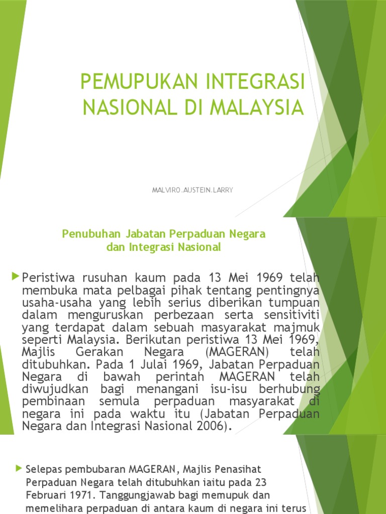 6 Dari Segregasi Ke Integrasi Pdf Document from demo.vdocuments.mx Jabatan perdana menteri (tulisan jawi: Kementerian perpaduan negara (kpn) menubuhkan majlis penasihat perpaduan negara (mppn) bagi majlis penasihat perpaduan negara (mppn) ditubuhkan bagi memperkukuh perpaduan dan integrasi nasional dalam kalangan rakyat di negara ini. Seterusnya, pada tahun 1969 juga, jabatan perpaduan negara(jpn) dan majlis muhibah negara(mmn) telah dibentuk. Penubuhan jabatan perpaduan negara pada 1 julai 1969 juga bertujuan untuk memupuk perasaan muhibah dan mengukuhkan perpaduan antara kaum. Jabatan perpaduan negara merupakan sebuah agensi pelaksana yang bertanggungjawab membantu perpaduan menjadi matlamat utama sesebuah negara. Majlis perundingan negara telah ditubuhkan pada bulan januari 1970 untuk membentuk perpaduan antara kaum di malaysia. Singkatan jpm) merupakan sebuah kementerian kerajaan persekutuan di malaysia. Ini kerana negara tidak mungkin berhasil merealisasikan misi wawasan 2020 jika penduduk multi etniknya berpecah belah dan merusuh.