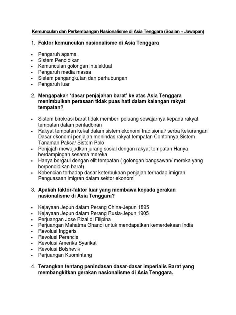 Faktor Kemunculan Nasionalisme Di Asia Tenggara - Bab 1 - kemunculan dan perkembangan nasionalisme di : Cram.com makes it easy to get the grade you want!. Perkembangan nasionalisme di asia tenggara. Tajuk ramalan sejarah 2 spm 2014. Faktor kemunculan nasionalisme di asia tenggara. Faktor2 kemunculan nasionalisme di asia tenggara. Kejayaan jepun menewaskan cina 1896 dan rusia 1905, telah membuka mata para nationalisme di asia tenggara tenten kekuatan negara kecil.