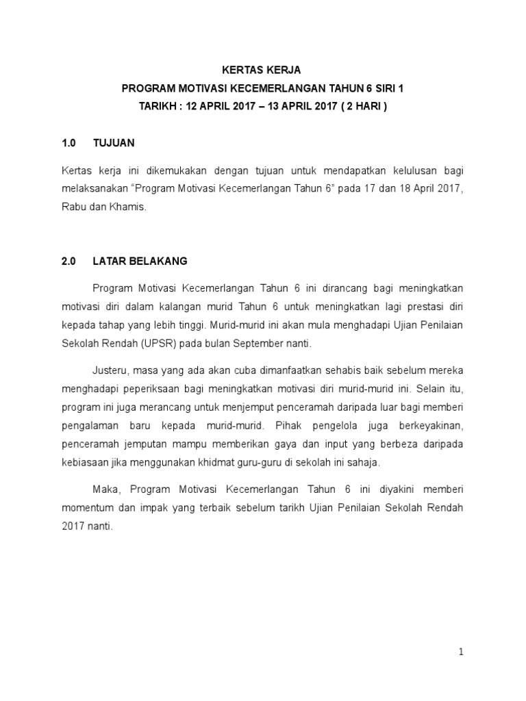 Kertas kerja dasar program motivasi jatidiri kepimpinan dan pembinaan sahsiah (permata) 1.0 pengenalan: 0 ratings0% found this document useful (0 votes). A) cara belajar yang cemerlang. Kertas kerja motivasi tahun 6. Dari sumber yang sama, statistik menunjukkan bahawa daripada 4 431 pelajar yang berdaftar di tahun 6 pada tahun 2009, hanya 3 100 (70 faktor motivasi integrasi perlu diambil kira dalam usaha meningkatkan kemahiran literasi dan.